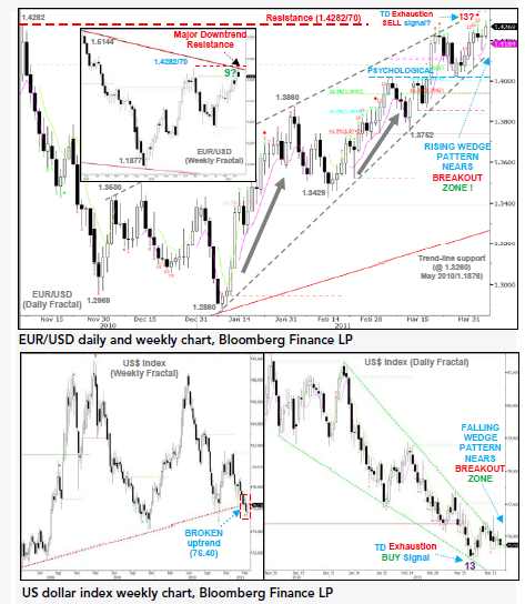 Бычье обратное движение EUR/USD достигло еще другой новый максимум года. Движение также бросило вызов ключевой зоне слияния между 1.4270-1.4282 (годовой нисходящий тренд/ пик ноября 2010 года) и мы продолжаем наблюдать за подтверждением перед завтрашней публикацией основной процентной ставки Европейским Центральным Банком.