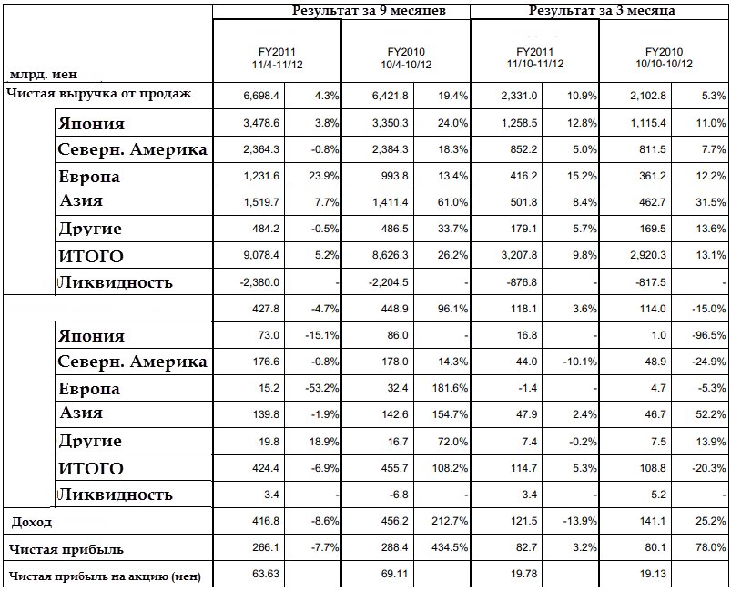 Напомним, в Японии финансовый год заканчивается в марте месяце, а его итоги подводятся к началу лета. Поэтому при оценке финансовой деятельности Nissan Motor Co. будем оперировать результатами 9 месяцев (апрель-декабрь 2011 года). Так вот, за этот период компания: