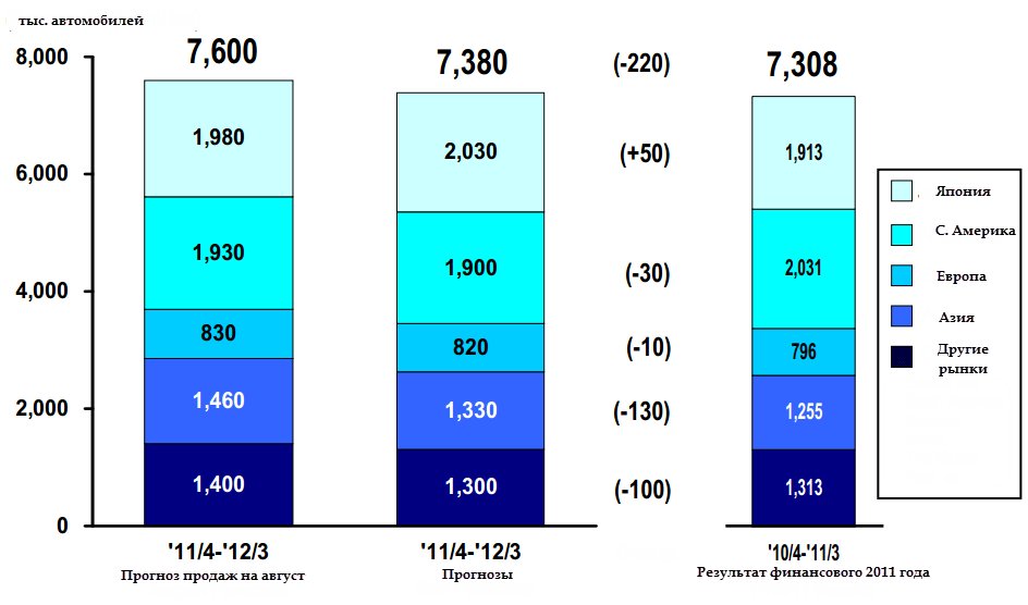 ■ природные катаклизмы 2011 года. Речь идет, конечно, о трагическом землетрясении в Японии, наводнении в Таиланде, из-за них компания все же понесла ощутимые убытки. Тысячи новехоньких авто были смыты водой и уничтожены огнем. Не говоря уже об остановленных из-за повреждений и призывов японского правительства к экономии электроэнергии заводах;