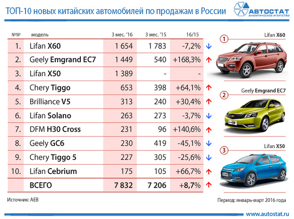 На второй ступени разместился автомобиль Geely Emgrand EC7. Всего в первом квартале текущего года бренд Китайской Народной Республики смог продать 1 тысячу 449 единиц данного автомобиля - это в 2,7 раза больше чем за весь прошлый год, что стало самым существенном показателем повышения в рейтинге. Первую тройку замыкает автомобиль Lifan Х50 с 1 тысячей 389 реализованными машинами. При том, дебют машины на автомобильном рынке Российской Федерации состоялся только летом прошедшего года. В первую пятерку также вошли кроссоверы Chery Tiggo (653 единиц; +64,1 процента) и Brilliance V5 (313 единиц; +30,4 процента).