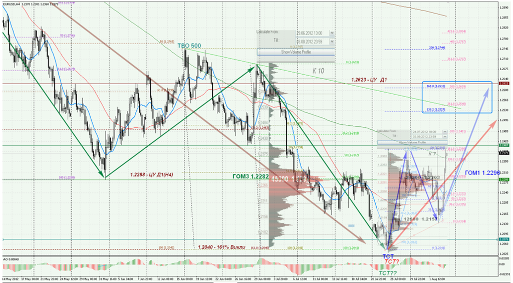 Николай Киреч: К 24 июля падение евродоллара достигло целей: 161% (1.2040), на рисунке видим трехволновку вниз зеленого цвета. В третьей зеленой максимум объемов на уровне 1.2282. В последовавшей синей волне вверх цена пробила указанный уровень, это было основанием считать, что движение вниз в зеленой трехволновке завершено. В синей волне вверх максимум объемов смещен к верхней части движения, этот факт подсказывает о вероятности разворота среднесрочки. После корреции (вторая синяя) стало возможным рассчитать цели третьей волны вверх(161% от первой синей), здесь же уровень 1.2623(ценовой уровень по пикам волн старшего таймфрейма).