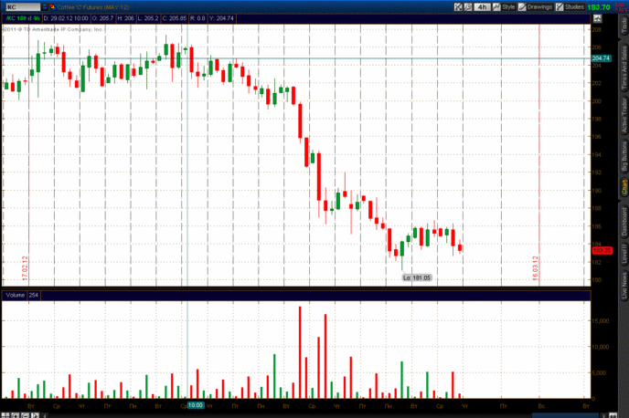 Новости биржи, кофе. Цена на кофе «Арабика» падала две недели с конца февраля. В понедельник 12.03.12г. она достигла минимума и отскочила от уровня 180, где была последний раз 17 месяцев назад. Эти три дня арабика торгуется между уровнями 180 и 186,5.