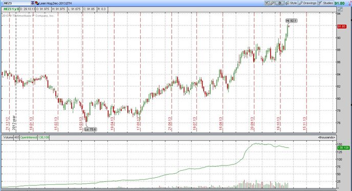 Цена на фьючерс свинины (lean hogs) декабрьской серии вчера, 28 октября, обновила многомесячный максимум, и на данный момент торгуется возле отметки 92 доллара за фунт. Как отмечают трейдеры кафедры опционной торговли Академии Masterforex-V, рост цены на бирже связан с сезонной тенденцией, так как именно в этот период начинается накопление запасов перед повышенным спросом на новогодние праздники.