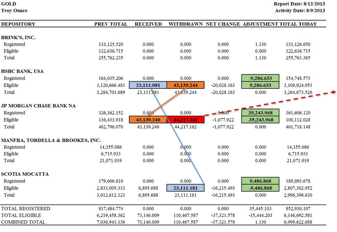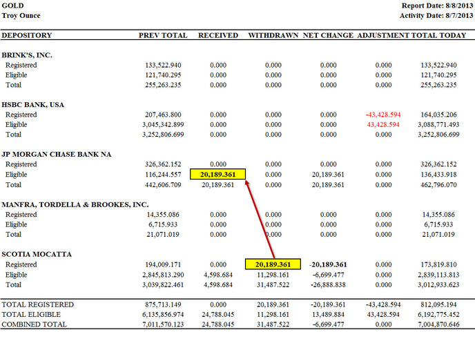 События развивались следующим образом: 6 августа JPMorgan перевёл 63.5 тыс. унций с именных счетов на обезличенные (так обычно делается перед тем, как золото покидает банк). В этот же день HSBC перечислил именного счета (по-видимому, спешили, поэтому перед переводом на обезличенный счет у себя переводить не стали) 6.45 тыс. унций, вероятно - больше не было: