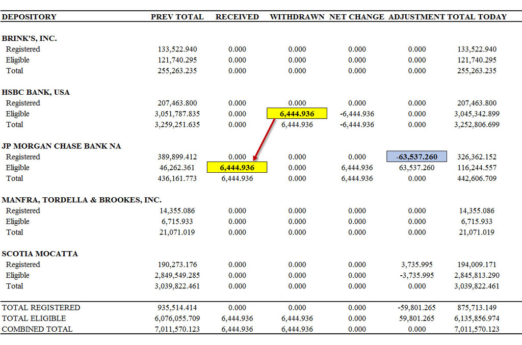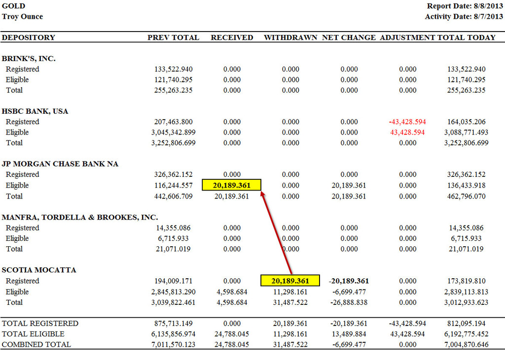 На следующий день HSBC перевел у себя 43.4 тыс. унций с именного на обезличенный счет. А ScotiaMocatta перечислила (опять же с именного счета!) 20.2 тыс. унций на счет JPMorgan: