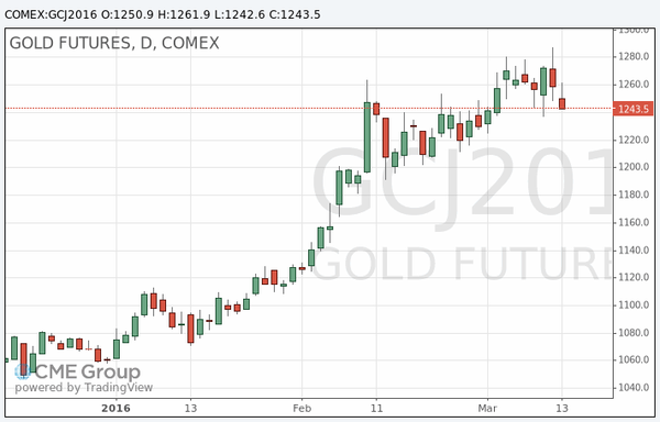 Хедж-фонды, как и управляющие инвестициями, нарастили количество длинных позиций в золоте на бирже COMEX до максимального уровня за 13 месяцев на неделе до 8 марта. Информация получена от Комиссии США по торговле сырьевыми фьючерсами. Физический спрос в Китае уменьшился на прошлой неделе. Ювелиры в Индии забастовали против дополнительного налога на золотые украшения. «Стоимость апрельского фьючерса на золото на COMEX сегодня, 14 марта, понизилась до 1242,60 USD за унцию», - утверждают аналитики Форекс-компании TeleTrade.
