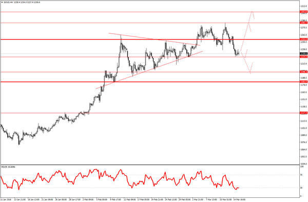 Сегодня, 15 марта, золото находится под давлением, график цены уверенно дошел до поддержки на уровне 1224,5 доллара за унцию. Вместе с тем курс иены поднялся против доллара США, так как Банк Японии в соответствии с ожиданиями трейдеров не изменил свою политику. Кроме того, регулятор ухудшил прогноз для своей экономики. Это также не остановило иену от укрепления, отметили аналитики FIBO Group.