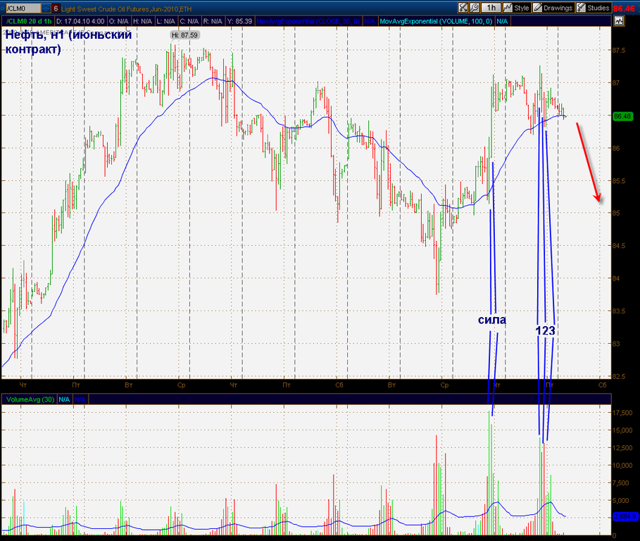 Бар 1. Бар со средним спредом, закрытием в середине и на самом большом объеме дня. Аптраст - признак слабости.