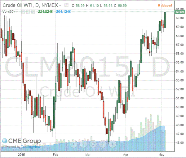 Нефтяные фьючерсы заметно подорожали сегодня, 5 мая, достигнув отметки 61 доллар (WTI) и 68 долларов (Brent), что связано с ожиданиями публикации данных по запасам нефтепродуктов в США. Об этом журналистам раздела «Новости Форекс» портала «Биржевой лидер» сообщили аналитики Forex-компании TeleTrade. Американский институт нефти планирует опубликовать свой отчет по запасам уже сегодня, в то время как правительственные данные выйдут в среду (по прогнозам, товарные запасы нефти в США увеличились на 1,2 млн.). На прошлой неделе запасы выросли на 1,9 млн., до 490,9 млн баррелей, достигнув рекордно высокого уровня за 80 лет.