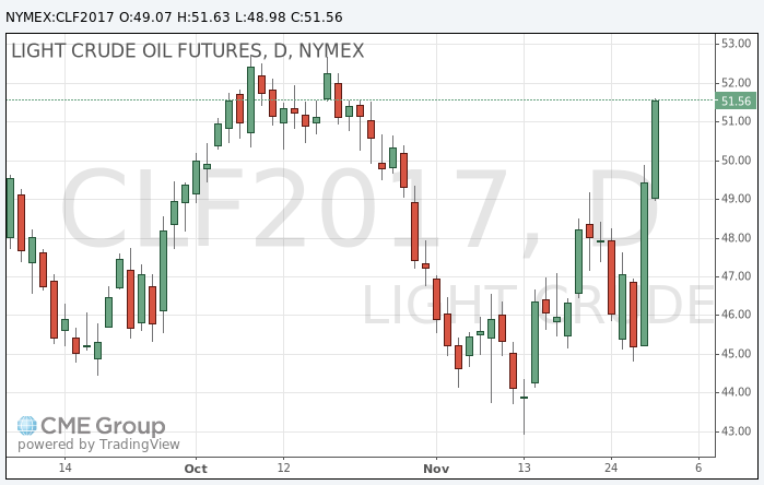 По данным аналитиков Форекс компании TeleTrade, стоимость январских фьючерсов на американскую легкую нефть марки WTI (Light Sweet Crude Oil) сегодня, 1 декабря, выросла до 51,72 доллара за баррель на Нью-йоркской товарно-сырьевой бирже. Цена январского фьючерса на североморскую нефтяную смесь марки Brent выросла до 54,36 доллара за баррель на Лондонской бирже ICE Futures Europe.