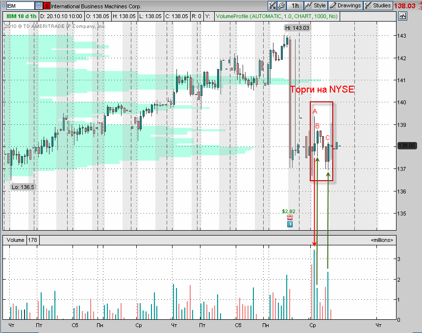 Первый час торгов на американской бирже (бар А) можно расценивать как скупку крупными игроками акций у слабых держателей, обеспокоенных падением цены. В пользу покупок говорит закрытие часа с повышением, несмотря на длинную верхнюю тень, а так же то, что следующий час (бар В) является признаком силы. Два последующих часа торговались с понижением на низком объеме, что говорит о незаинтересованности крупных игроков в падении цен. Далее (точка С) следует двухбарный патерн, соответствующий заинтересованности "умных денег" в скупке большого количества недооцененных акций.
