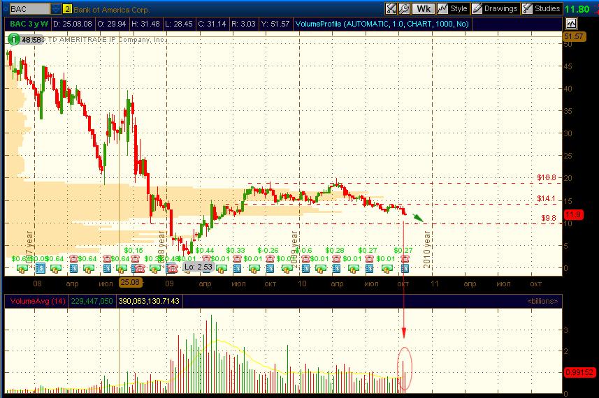 Как отмечает Татьяна Кетрарь, аналитик кафедры анализа биржевых настроений, акции Bank of America (BofA) в течение последнего года не выходили из ценового коридора 14,1 –18,8$. С началом III квартала котировки опустились ниже уровня поддержки 14,1$, закрепились под ней, определив дальнейшее направление тренда как медвежье. Выход квартального отчета ускорил падение акций банка - крайне высокий объем на последних даун-барах говорит о том, что участники рынка активно сбрасывают стремительно падающие в цене активы. Ближайший уровень, на котором падение может притормозить – 9,8$. Если уровень будет преодолен с такой же силой, целевую область следует искать недалеко от абсолютного минимума.