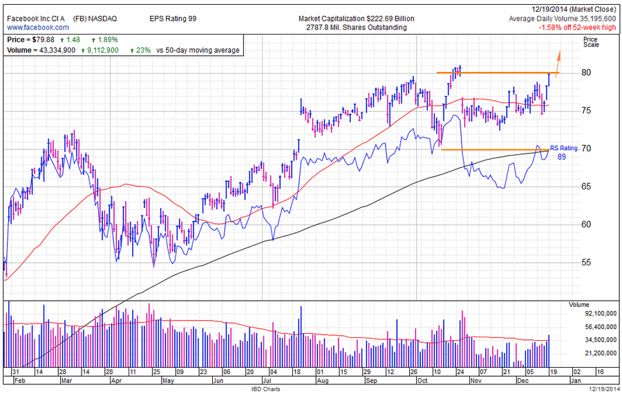 Согласно рекомендациям IBD, при прорыве максимума 81,26 и закреплении за ним при растущем фондовом рынке США, получение прибыли инвесторами при покупке акций Facebook более вероятна.