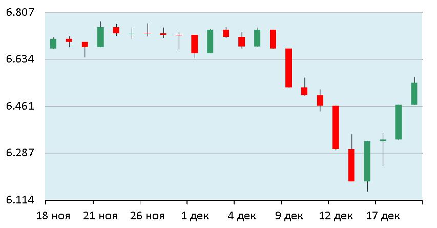 Индекс РТС, довольно чувствительный к колебаниям валютного курса, поднялся на 6 процентов в начале торгов понедельника при скромном повышении рублевого индекса ММВБ. К 10.10 МСК РТС индекс достиг 815 пунктов. Индекс ММВБ добавил 0,6 процента к уровню закрытия пятницы, до 1.456 пунктов. Курс рубля к доллару США поднялся на 4 процента, до 56,1. В рублевом выражении лучше других голубых фишек выглядят акции Сбербанка, прибавившие 3,5 процента после просадки на минувшей неделе. Продолжают пятничный рост бумаги ФСК. К настоящему моменту они подорожали на 8 процентов. Акции АФК Системы возросли на 5,5 процента. Сегодня, 22 декабря 2014, рынок акций открылся ростом по индексу ММВБ на 1%, но вскоре перешел в состояние понижения. Можно ожидать консолидации рынка по индексу ММВБ.
