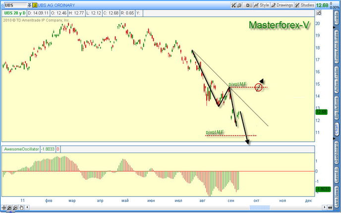 Так, по мнению экспертов факультета детального изучения торговой системы Masterforex-V цены акций UBS, начиная с апреля месяца неуклонно падают, формируя медвежью волну А уровня Mounthly, Такие мощные тренды меняются лишь раз на несколько лет. На лицо мощная волна С уровня Daily в авторской фигуре продолжение тренда "собака Баскервилей Элдера/МФ", которая продолжится в ближайшее время, а значит курс акций UBS упадет еще ниже. Для смены тенденции необходимо пробитие пивота МФ (см. график), закрепление над ним и разворот вверх: