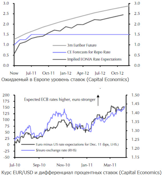 * Формулировка «strong vigilance» (особо бдительно) исчезла из стейтмента ЕЦБ от 07.04.11, что можно рассматривать как сигнал к тому, что в рамках майского заседания (05.05.11) мы, скорее всего, не увидим повышения учетной ставки.
