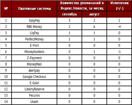 В список внесены платежные системы Интернета, о которых российские электронные СМИ ни разу не упомянули за месяц, что, по мнению экспертов, является "критической" точкой для их известности.