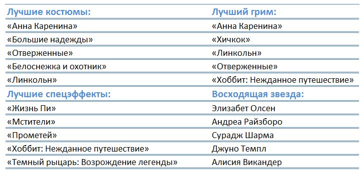 Стоит отметить, что экранное переложение суперпопулярного мюзикла "Отверженные" англичанина Тома Хупера, "Жизнь Пи" Энга Ли составили главную конкуренцию "Линкольну" с 9-ью номинациями на премию BAFTA для каждого.