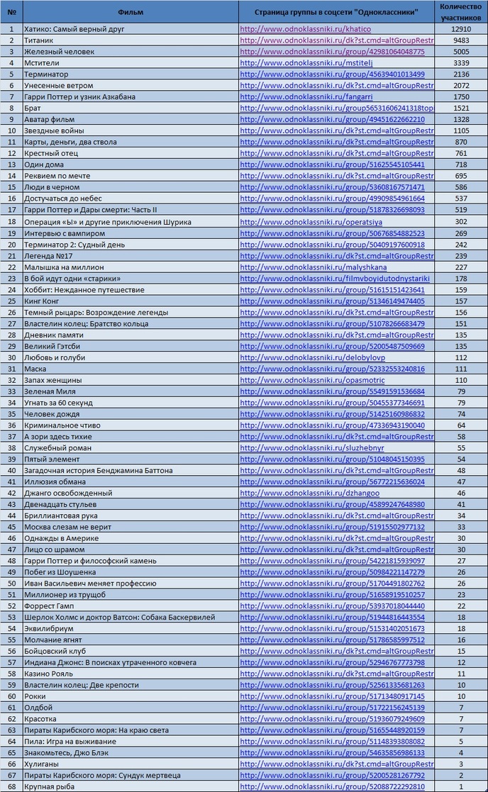 Для определения популярности того или иного фильма в социальной сети «Одноклассники.ру», аналитики «Биржевого лидера» отобрали группы, посвященные конкретному фильму, и отсортировали их по количеству участников.