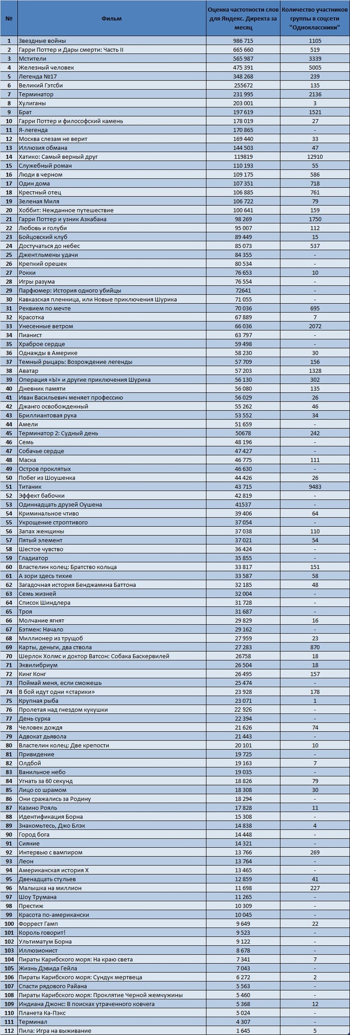 - популярность фильмов в социальной сети «Одноклассники» и поисковой системе Яндекс серьезно отличаются, как отличаются и лидеры рейтингов;