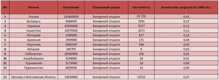 - самый низкий интерес жителей стран СНГ к запросу "бинарный опцион" в поисковой системе Яндекс за последние два года наблюдался в апреле-мае 2012 года (около 4,62 тысячи запросов);