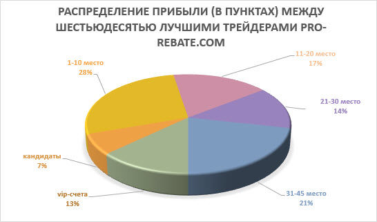 Из них прибыль VIP-счетов, а также прибыль счетов - кандидатов в VIP-счета в общем составила 11700 пункта, или 19,73% от всей прибыли лучших трейдеров: