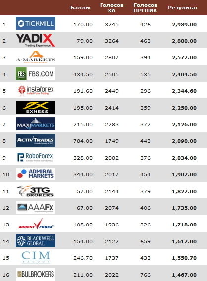 - первое место данного рейтинга досталось компании «Tickmill», которая специализируется на торговле на рынке Форекс и драгоценными металлами, предоставляет прямой доступ к межбанковскому рынку. Брокер работает по технологии STP, обеспечивая прямой доступ к крупнейшим поставщикам ликвидности: Credit Suisse, JPMorgan, Goldman Sachs, Citi, Societe Generale, UBS, Barclays, BNP Paribas, Bank of America, CIBC, Commerzbank, Deutsche Bank, Dresdner, HSBC, Morgan Stanley, Nomura, RBS;