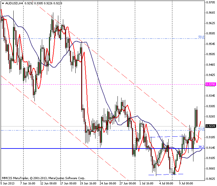 День 11 июля 2013 г. начался с продаж «аусси» на фоне того, что рынок получил информацию о негативной динамике индекса потребительской уверенности Австралии от Westpac, снившегося на 0.1%. Еще одним событием со знаком «-» стала публикация данных по сальдо торгового баланса в Китае — расхождение с ожиданиями в худшую сторону было некритичным, однако обе составляющие – как экспорт, так и импорт – показали существенное снижение объемов, что подтверждает идею о негативных тенденциях в экономике страны.