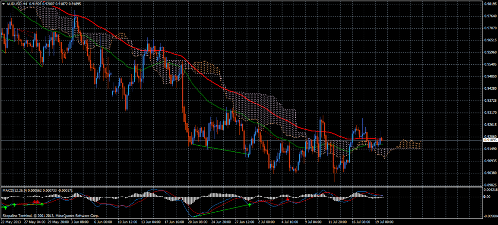 4-х часовой график уже начал консолидацию. Цена торгуется на уровне облака Ишимоку и скользящих средних EMA (50 и 100), что свидетельствует о вероятной коррекции в течение следующей недели. MACD средние так же как и импульсы OsMA лежат вблизи нулевого уровня, указывая на слабую активность рынка. Рис 2