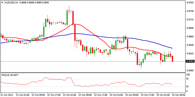 Краткосрочная ценовая активность валютной пары AUD/USD на сегодняшний день, 25 октября 2013 года, остается под давлением, так как расширение от 0.9670, где была оставлена более низкая вершина, привело к прорыву ниже начальной поддержки 0.9600. Очередное расширение вниз восстановило 38.2% от ралли 0.9280/0.9755 на падении к 0.9571, на данный момент, с краткосрочными индикаторами, скользящими на отрицательную территорию, что сохраняет вероятность движения валютной пары на рынке Форекс к нижней стороне, сообщили аналитикам раздела "Новости Форекс" портала "Биржевой лидер" эксперты компании FinFX (входит в ТОП рейтинга брокеров Форекс Академии Masterforex-V). Начальные цели лежат в области 0.9526/18, предыдущего пика/50% восстановления, наряду с психологической поддержкой 0.9500, укрепленной дневной 55DMA. Пробой здесь ограничит краткосрочных «быков» и запустит сильную коррекцию от ралли 0.9280/0.9755, поскольку верхняя сторона остается ограниченной нисходящей 200DMA.