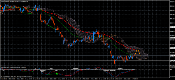 Валютная пара AUD/USD, единственная из валютных пар, которавя отработал ожидаемую цели и спустился вниз обновив минимум. Торговый диапазон составил порядка 314-ти пунктов. Отметка High поднялась к максимуму – 0.8030 в то время как Low уровень, можно было видеть у минимума – 0.7720. Сегодня, 2 февраля 2015, ожидаем коррекцию цены на уровне облака Ишимоку, отметили аналитики Forex Trend.