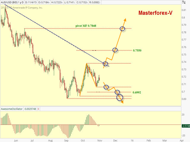 Курс австралийского доллара остается в коррекции к долгосрочному понижательному тренду. "Пара AUD/USD завершила "медвежью" волну А/В уровня не менее, чем Daily", - сказали корреспондентам эксперты факультета онлайн-обучения торговой системы Masterforex-V. 04 ноября 2015 года пара остается в зоне предполагаемой восходящей волны А/В. Пробой максимума 0.7380 и нисходящего долгосрочного наклонного канала МФ укажет на начало восходящей волны А/В уровня Daily2. Ближайшее сопротивление расположено на уровнях Фибоначчи 0.7518/50. Также сопротивлением выступает пивот МФ 0.7848. Пробой минимума 0.7066 покажет начало нисходящей волны А/В уровня Daily2. Поддержками выступают уровень Фибоначчи 0.6992 и минимумы 0.6935 и 0.6907.