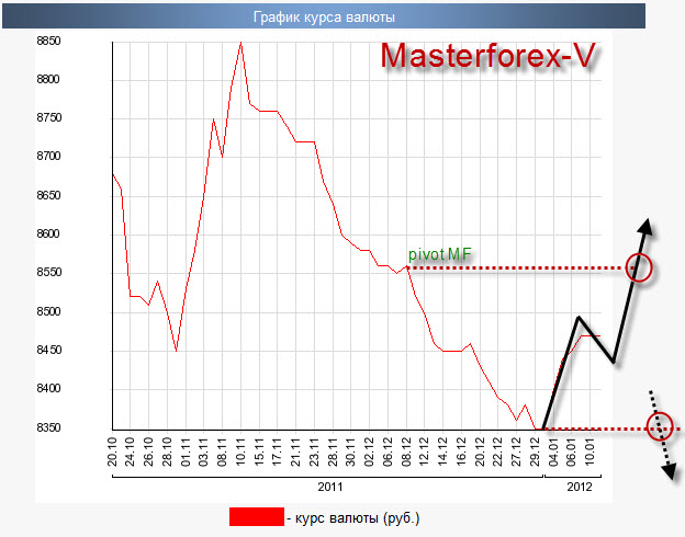 Пробив пивот МФ курс белорусского рубля завершил медвежью волну 8850-8350 и на данном этапе формирует коррекционную волну к ней - поясняют эксперты факультета изучения торговой системы Мasterforex-V. На пути коррекционного движения расположено важное сопротивление - пивот МФ 8560. Пробитие же минимума укажет на дальнейшее медвежье движение, направленное на укрепление рубля, в виде волны С.