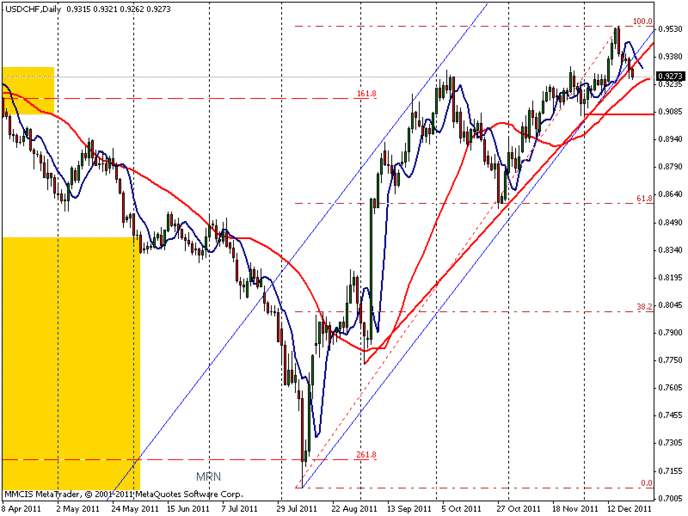 Аналитики компании «FOREX MMCIS group» предполагают продолжение снижения котировок USD/CHF и EUR/CHF в краткосрочной перспективе на фоне начавшейся коррекции после тенденции ноября-декабря. Вероятней всего, ближайшая цель снижения USD/CHF —0.9070.