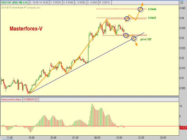 Курс франка остается в долгосрочном тренде на ослабление. Пара USD/CHF находится в "бычьей" волне 3/С уровня не менее, чем Daily. 16 сентября 2014 года наблюдается формирование предполагаемой подволны 4-й и прорыв максимума 0.9394 укажет на начало подволны 5-й или подволны а в фигуре продолжения тренда "Собака Баскервилей Элдера/МФ". "Ближайшими сопротивлениями выступают уровни Фибоначчи 0.9402, 0.9446", - говорят эксперты факультета онлайн-обучения торговой системы Masterforex-V. Снижение с пробоем минимума 0.9318 укажет на начало предполагаемой волны А/В уровня не менее, чем Н8. Ключевыми сопротивлениями выступают восходящий наклонный канал МФ и пивот МФ 0.9313.