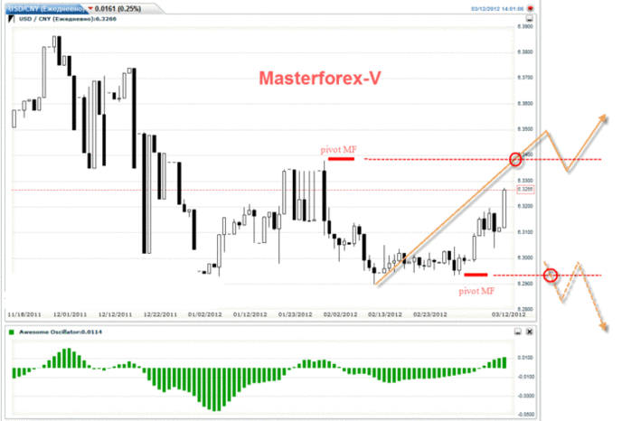 Относительно ситуации на рынке форекс, эксперты факультета изучения торговой системы Masterforex-V объяснили, что курс юаня пробил наклонный канал МФ и продолжил формирование бычьей волны А/В уровня Daily. Для дальнейшего бычьего движения необходимо преодолеть сопротивление пивота МФ 6.3380. Его преодоление с последующим ФЗР может служить основанием для разговора о смене медвежьего тренда на бычий. Для продолжения медвежьего тренда "короткой" волной С уровня Daily 2 необходимо пробитие пивота МФ 6.2934 с последующим ФЗР.
