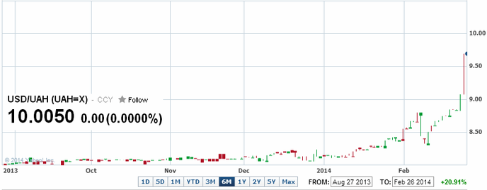 Сегодня, 27 февраля 2014 года, по состоянию на 16:10 МСК курс гривны к американскому доллару торгуется на показателе 10,0050 гривны за 1 доллар США.