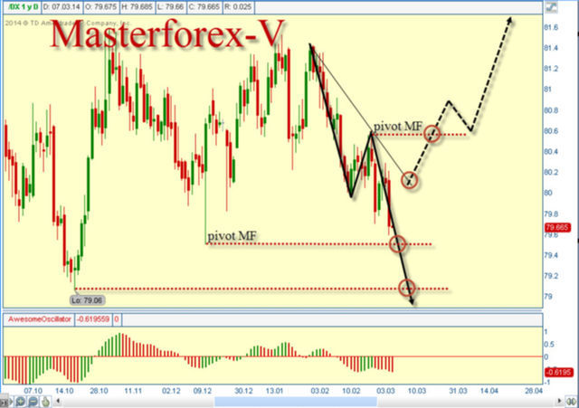 "Сегодня, 7 марта 2014 года, курс доллара продолжает формировать долгосрочное нисходящее движение и торгуется на уровне 79,66", - говорят аналитики факультета онлайн-обучения торговой системе Masterforex-V. Важными уровнями поддержки выступают уровень пивота МФ 79,52 и минимум на отметке 79,06. Наклонный канал МФ и пивот МФ 80,58 являются уровнями сопротивлений.