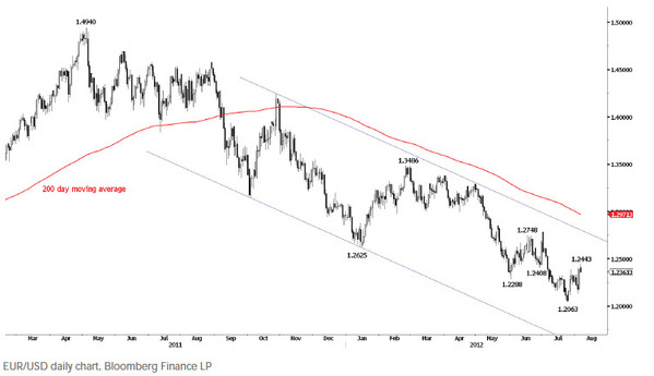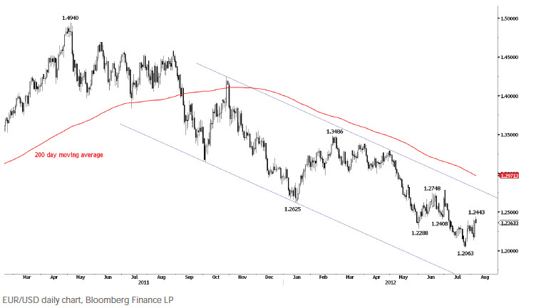 Пара евро/ доллар вернулась в пятницу, чтобы повторно протестировать ключевой минимум 1.2408, сформированный в конце июня, на этот раз достигая уровня 1.2443. Таким образом, наше предположение, что коррекция от 1.2063 закончилась, было ошибочным. Однако, первые признаки спроса вблизи 1.2400 предполагают вероятность формирования вершины вблизи текущих уровней.