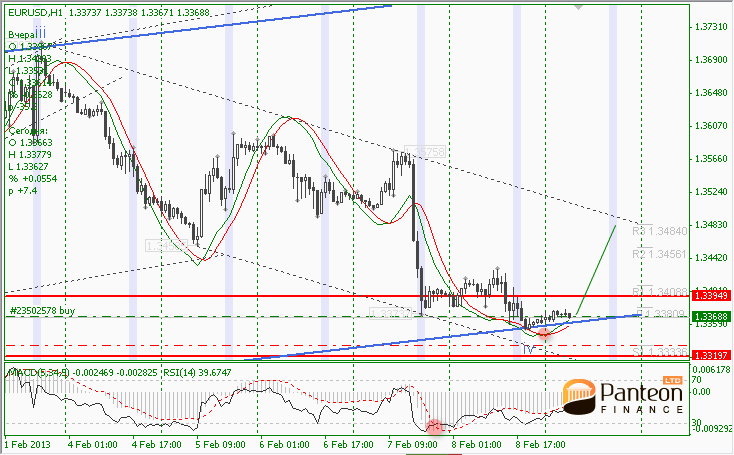 Объем торгов сегодня, 11 февраля, контрактами по паре EURUSD на CME составил 5988 единиц. Ушли из района перепроданности осцилляторы MACD и RSI. Устремились вверх средние скользящие при этом они пересечены. Волновой цикл сформировал коррекционную волну iv. Возможен рост цены в качестве импульса v. Уровни трендовые дня: 1,33197; 1,33949. Уровни сопротивления: 1,33809; 1,34088. Уровни поддержки: 1,33336; 1.33057.