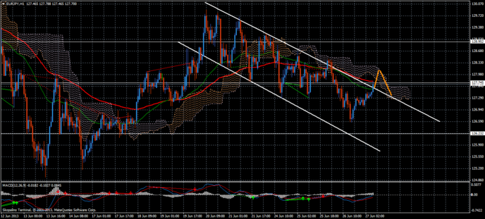 Торговый диапазон евро/иены на Forex составил вчера, 26 июня 2013 года, 186 пунктов. Отметка low отскочила от цены 126.56, при этом уровень high, не выходя с зоны коррекции, сформировался еще ночью на уровне 128.42. Сегодня, поскольку пара вышла из канала, ожидаем коррекцию в зоне облака Ишимоку.