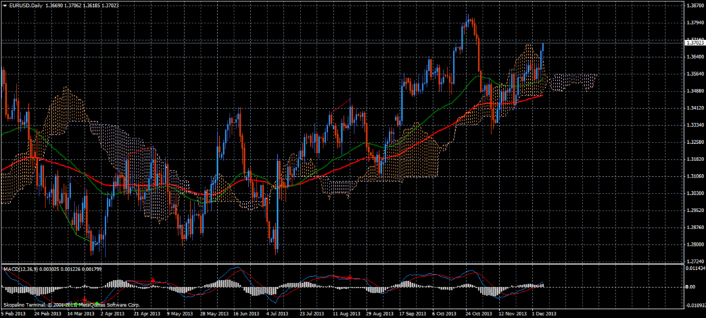Пара EUR/USD наслаждается спокойствием в Европе и движется все выше. На прошлой неделе ЕЦБ оставил политику без изменений в соответствии с прогнозом рынка и сохранил ультра-низкие процентные ставки. Президент ЕЦБ Марио Драги объявил на пресс-конференции о том, что ключевые процентные ставки будут оставаться низкими в течение длительного периода времени. ЕЦБ даже незначительно повысил прогноз экономического роста на 2014 год. Только вот удастся ли Еврозоне добиться реального подъема? ЕЦБ не предоставил ни каких-либо мер, ни намеков, евро демонстрирует ралли. Отрицательные ставки по депозитам обсуждались лишь кратко, главным посланием Драги было пожелание "счастливых праздников".