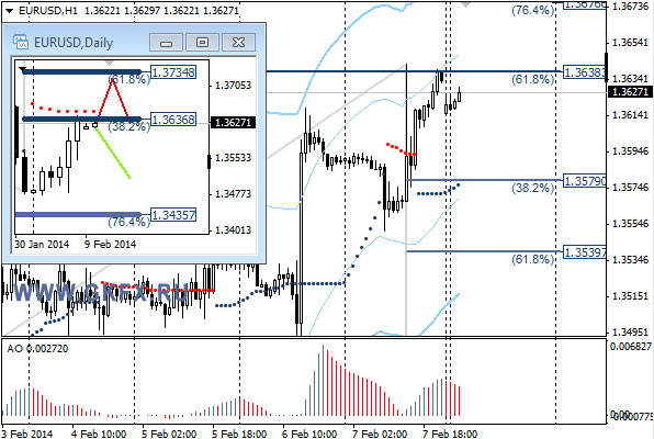 Пара EUR/USD в пятницу, после данных по рынку труда США, выросла до новых недельных максимумов на рынке Forex. Данные по рынку труда США второй месяц подряд выходят слабые, и это начинает волновать рынок, так как дальнейшее сокращение QE3 может быть отложено. По этой причине доллар может начать терять позиции на этой неделе. Учитывая слабые пятничные данные, доллар может сегодня продолжить демонстрировать слабость. На прошлой неделе цена отработала зеленый вариант сценария. "На эту неделю традиционно рассматриваю два варианта возможного движения цены: основной красный и альтернативный зеленый", - сообщил аналитикам раздела "Новости Форекс" портала "Биржевой лидер" эксперт брокерской компании GKFX (входит в ТОП рейтинга брокеров Форекс Академии Masterforex-V). Значимые уровни на сегодня, 10 февраля 2014 года, отмечены на часовом графике. Индикатор АО находится в положительной зоне и снижается, указывая на коррекцию курса валютной пары перед возможным продолжением роста на рынке Форекс. Индикатор тренда указывает на рост. Преодоление 1.3640 позволит войти в покупки с целями 1.3675 и 1.3700