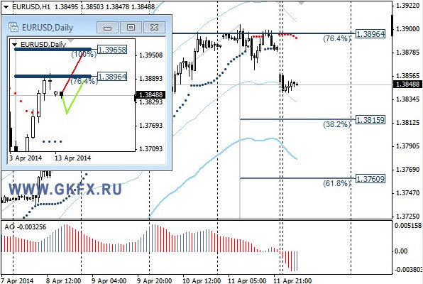 Пара EURUSD в пятницу на рынке Forex произвела выплеск вверх, достигнув последней цели по рекомендации на уровне 1,3900. Новая неделя будет короткой, так как в пятницу праздник в большинстве крупнейших экономик и активность на рынке Форекс в этот день будет низка. Нужно постараться успеть до пятницы забрать свое. Пытаемся продать в расчете на минимальную коррекцию. "На эту неделю традиционно рассматриваю два варианта возможного движения цены, основной красный и альтернативный зеленый", - сообщил эксперт брокерской компании GKFX. Значимые уровни на сегодня, 14 апреля 2014 года, отмечены на часовом графике. Индикатор АО находится в отрицательной зоне и растет, указывая на коррекцию перед возможным продолжением снижения курса валютной пары на рынке Форекс. Индикатор тренда указывает на снижение. Продажи от 1,3860 с целями 1,3840 и 1,3820.