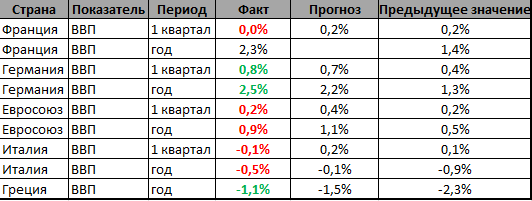 Согласно разочаровывающим предварительным данным по валовому внутреннему продукту (ВВП) еврозоны за 1 квартал, ВВП вырос на 0,2% по сравнению 4 кварталом 2013 года, вместо ожидаемого роста на 0,4%. Более слабые данные по ВВП еврозоны вышли после слабых данных из Франции, Италии и Нидерландов.