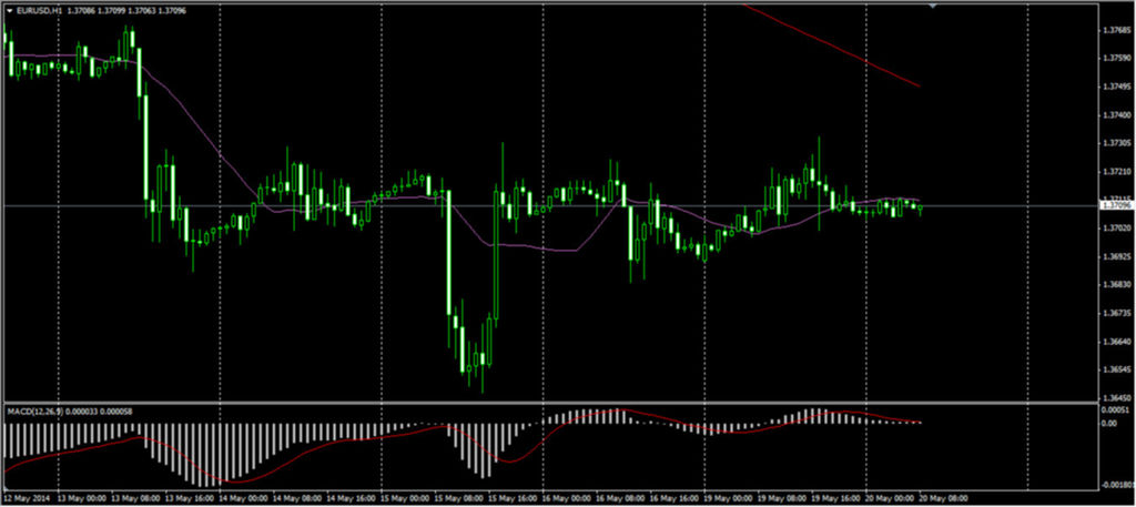Осциллятор MACD валютной пары EUR/USD на рынке Forex на часовом графике пересек нулевую линию, двигаясь на отрицательной территории, столбики гистограммы растут, что указывает на снижение курса валютной пары евро-доллар на рынке Forex. На 4-часовом графике мы видим, что MACD находится на отрицательной территории, столбики гистограммы начинают расти, указывая на снижение курса валютной пары на рынке Форекс, по мнению экспертов брокерской компании TurboForex. Пара евро-доллар продолжает торговаться в диапазоне, в котором торговалась в среду, 13 мая 2014 года, отметив в четверг минимум 1.3647, коснувшись восходящей недельной трендовой линии от уровня 1.2041, июльского минимума 2012 года, но в данный момент пара торгуется ниже часовой скользящей средней 55 ЕМА. Уровнем поддержки теперь становится минимум четверга. В качестве сопротивления выступает вчерашний максимум 1.3733, далее 1.3773, потом часовая 200 ЕМА, проходящая на данный момент через уровень 1.3748. В любом случае выход пары за пределы диапазона и определит направление движения.