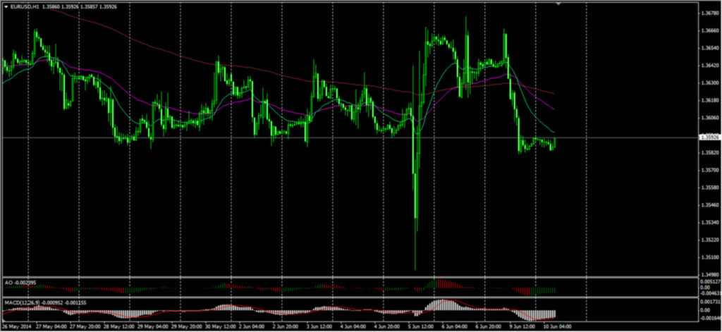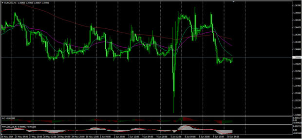 Осциллятор MACD валютной пары EUR/USD на рынке Forex на часовом графике переместился на отрицательную территорию, столбики гистограммы выравниваются, что указывает на неопределенность курса валютной пары евро - доллар на рынке Forex. На 4-часовом графике мы видим, что MACD также переместился на отрицательную территорию, столбики гистограммы растут, что указывает на рост курса валютной пары на рынке Форекс, по мнению экспертов брокерской компании TurboForex. Вчера, 9 июня 2014 года, пара отметила минимум 1.3581 на фоне выступления председателя региональной Федеральной Резервной Системы. Сегодня мы видим, что пара евро-американский доллар консолидируется в районе вчерашнего минимума нижечасовых скользящих средних 55ЕМА и 200 ЕМА. Теперь в качестве сопротивления можно рассматривать эти часовые скользящие, далее максимум пятницы 1.3676. Уровнем поддержки будет минимум 5 июня 1.3502.