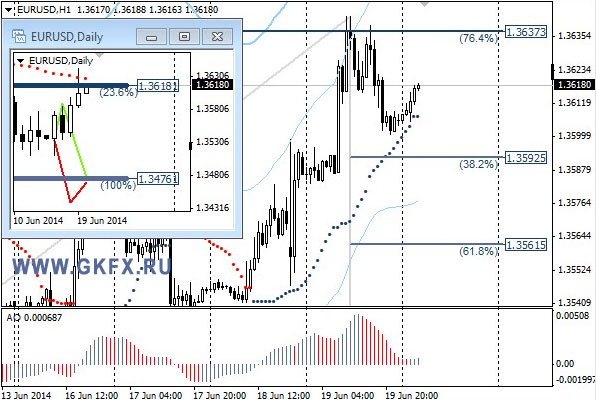 Пара EURUSD оправдала предположение о росте на рынке Форекс в район 1,3635/50. После снизившихся прогнозов по росту экономики США, доллар потерял устойчивость и снизился против большинства основных валют. Рекомендаций не давалось, так как движение в данное время происходит не по плану. "На эту неделю традиционно рассматриваю два варианта возможного движения цены, основной красный и альтернативный зеленый", - сообщил эксперт брокерской компании GKFX. Значимые уровни на сегодня, 20 июня 2014 года, отмечены на часовом графике. Индикатор АО находится в положительной зоне и растет, указывая на желание пары двигаться вверх в данное время. Индикатор тренда указывает на рост курса валютной пары евро - американский доллар на рынке Форекс. Следует оставаться вне рынка.