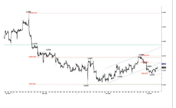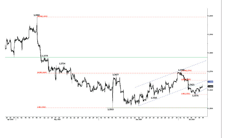 Курс валютной пары EUR / USD совершает откат на рынке Forex. Часовое сопротивление на отметке 1,3621 пробито, тем не менее, по мнению экспертов компании Swissquote, следует отдавать предпочтение снижению, по направлению к поддержке 1.3503, пока цена остается ниже сопротивления на уровне 1.3664 (максимум 03 июля 2014 года).Часовая поддержка для курса валютной пары евро - американский доллар может быть найдена на уровне 1,3565 (минимум 20 июня 2014 года).