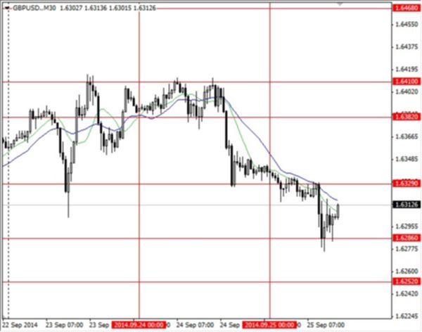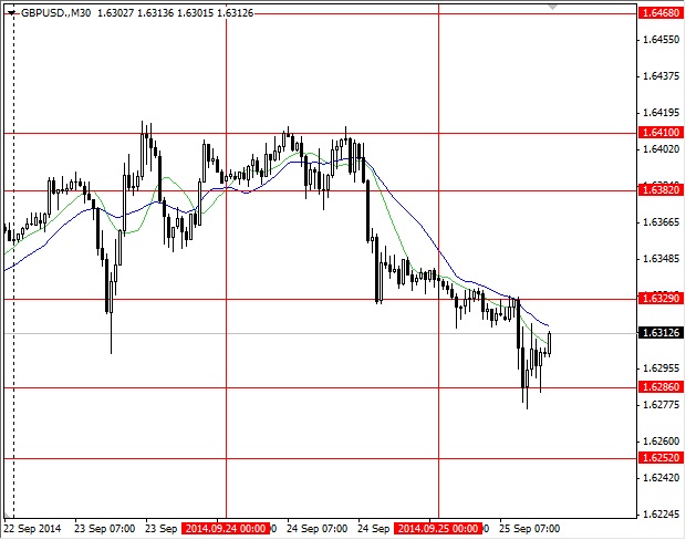 Как отмечалось в прошлом обзоре, пара GBP/USD вчера в первой половине дня торговалась в узком диапазоне, ограниченном уровнем сопротивления 1.6410, поддержки – 1.6382. Пробой поддержки произошел на ожиданиях положительных данных по рынку жилья США. А после публикации официальных данных фунт подобно евро продолжил свое снижение. Поддержкой паре GBP/USD послужил уровень 1.6328, в течении американской сессии и азиатской сессии 25 сентября пара продолжала колебаться около уровня 1.6328, а с началом европейской сессии фунт продолжил снижение. Сегодня поддержкой для пары GBP/USD служит уровень 1.6286, сопротивление – 1.6329.
